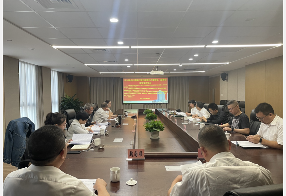 沈建平董事长向各位董、监事及监管领导简要汇报了该行目前经营发展状况,并组织该行董、监事学习交流《关于辖内银行机构2022年半年度消费投诉指标监测情况的通报》(湖银保监办便函〔2022〕55号)、《中国银保监会湖放监管分局关于银行业保险业贯彻落实一揽子金融纾困政策措施的通知》(湖银保监发〔2022〕58号)、《湖州市人民政府金融工作办公室 中国人民银行湖州市中心支行 中国银保监会湖州监管分局关于印发<湖州市“金融惠农”共富班车实施方案>的通知》(湖金融办〔2022〕13号)等监管文件。
