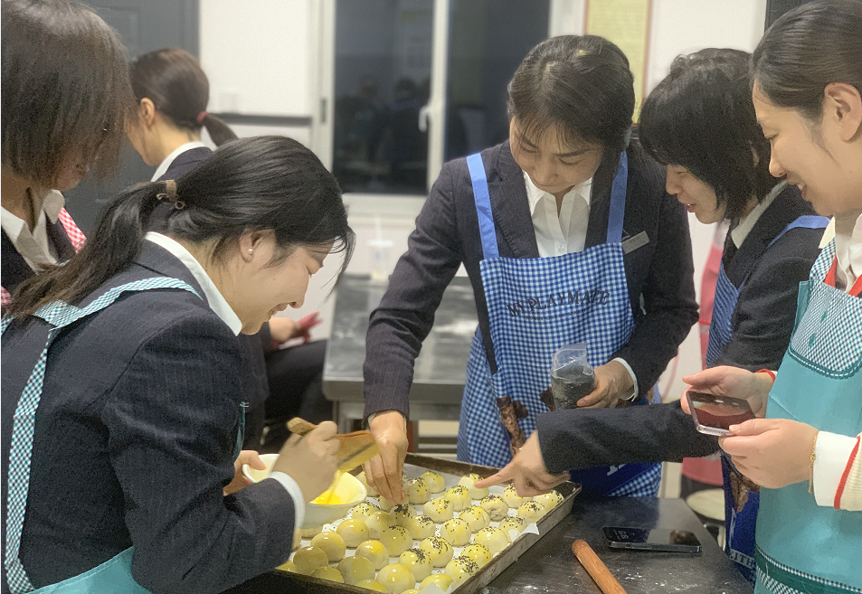 活动现场,弥漫着香甜味道,气氛温馨,其乐融融,在烘焙老师悉心讲解、示范与指导下,大家边学边做,各司其职,井然有序。为了避免制作失败,每一步操作都特别小心翼翼、紧跟步骤,大家相互讨论,相互学习、相互分享,在欢声笑语中揉面、擀皮、包馅,忙得不亦乐乎。不过,制作过程中有些小组还是遇到了些困难,油酥没有揉搓好、面皮没有醒好、面皮小剂子分不均匀等等,大家都虚心向老师请教,一个个圆圆的小面团就制作完成了。最后,大家给面团刷上蛋液、撒上芝麻、送入烤箱,等待成品。经过半个小时的等待,新鲜的蛋黄酥出炉了,看着烤好的蛋黄酥,色泽金黄诱人,大家由衷欢呼,体验到了满满的成就感。活动在甜蜜与欢乐的氛围中画上了圆满的句号。