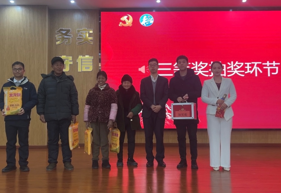 “下面有请长兴联合村镇银行吕山支行的客户经理上台做工作汇报”,伴着书记的介绍和台下的掌声,客户经理走上主席台,向全体村民汇报这一年以来的工作成绩,展示了我行龙年贺岁特色产品孝心存折及贺岁存单,并通过一系列反诈知识的有奖竞猜,为村民送上冬日暖心礼品,会场的氛围随之达到高潮。
