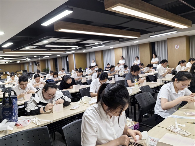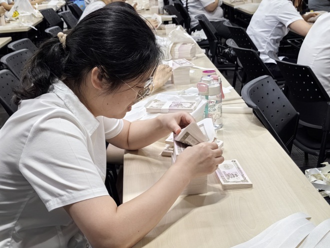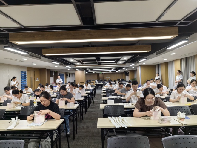 当晚,考场内此起彼伏的点钞声,员工们全神贯注、手法娴熟,严格按照考试规则在规定时间内完成点钞、捆扎、盖章等全流程操作。每位员工动作规范、节奏紧凑,充分展现了日常技能训练的扎实成效。现场既有青年员工的敏捷身手,也有资深员工的沉稳应对,紧张有序的氛围中洋溢着“比学赶超”的浓厚氛围。