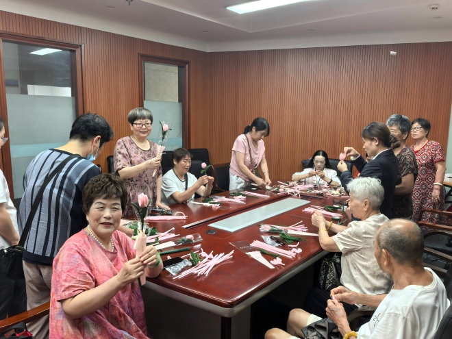 活动伊始,银行工作人员化身“手工老师”,耐心地教大家叠花瓣、拧花茎、系丝带。遇到年纪大的客户,会放慢语速一步步演示。阿姨们专注投入,指尖翻飞间,一朵朵形态各异的手工花逐渐成型。工作人员全程融入互动,在协助客户完成手工的同时,以“聊天式”沟通了解客户需求——对有闲置资金的客户,介绍定期存款与大额存单的利率优势。