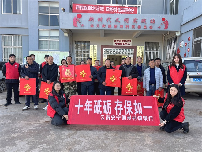 新春将至,年味渐浓。为切实提升辖区村民的金融风险防范意识,筑牢金融安全防线,同时让村民们提前感受甲辰岁末的新春氛围,1月26日,云南安宁稠州村镇银行营业部携手普河村委会开展防范电信诈骗、存款保险主题宣传活动,将金融安全知识与新春福礼一同送到村民家门口,以专业金融服务与暖心民生关怀,架起银村连心桥。