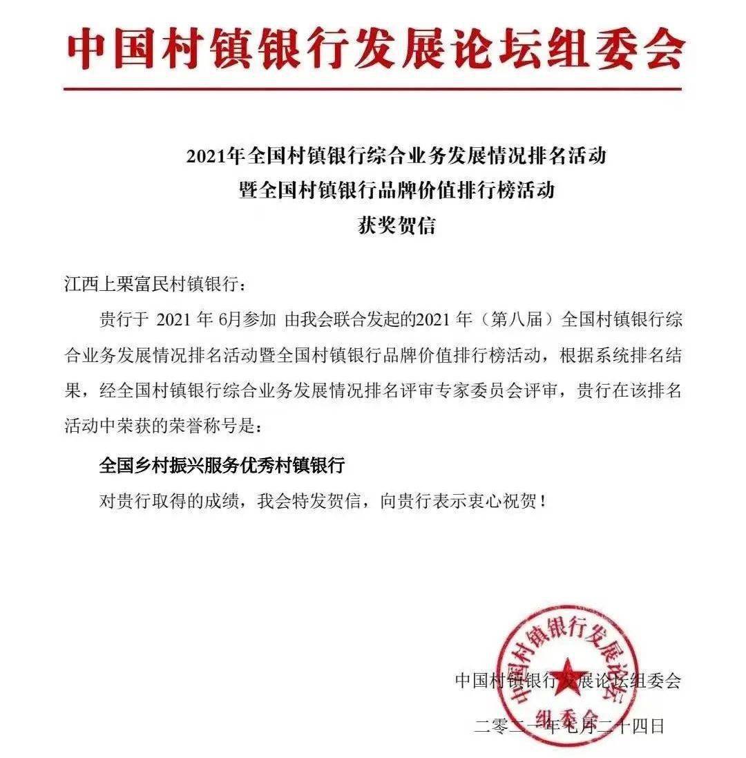 - 近日,在2021年全国村镇银行综合业务发展情况排名活动暨全国村镇银行品牌价值排行榜活动中,上栗富民村镇银行荣获“全国乡村振兴服务优秀村镇银行”称号。