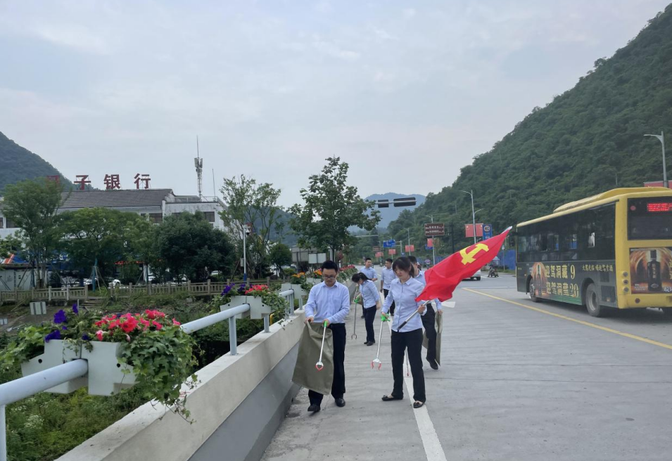 当日下班后,8名自愿参加活动的党团员同志便在行门口集合,拿起工具,扛起党旗,沿着茶城大桥至金钱山大道农商行红绿灯路段及金山阳光小区31-37栋开始清扫活动。