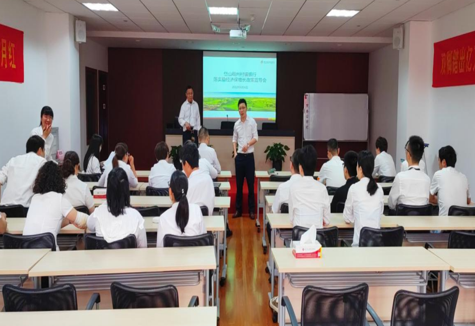 6月8日,浙江岱山稠州村镇银行组织开展了贯彻落实稳经济一揽子政策措施宣导会,全体员工参加。