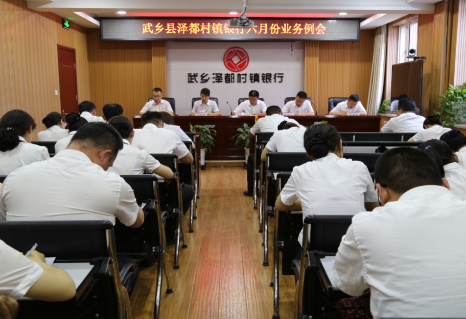 6月10日晚,武乡泽都村镇银行在总行二楼会议室召开六月份业务例会。行领导班子、各支行、部室负责人及全体员工参加了会议,会议由副行长刘强主持。