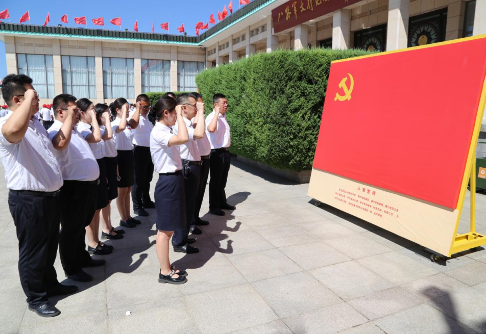 在纪念馆入口处,面对鲜红的党旗,党支部成员、行长杨勇江同志带领党员一起高举右手,庄严宣誓:“我志愿加入中国共产党,拥护党的纲领,遵守党的章程……”,表达了为党的事业奋斗终身的决心和愿望,体现了对中国共产党的无限忠诚。