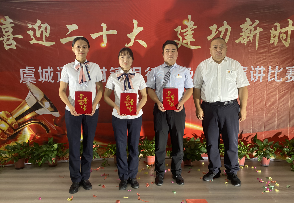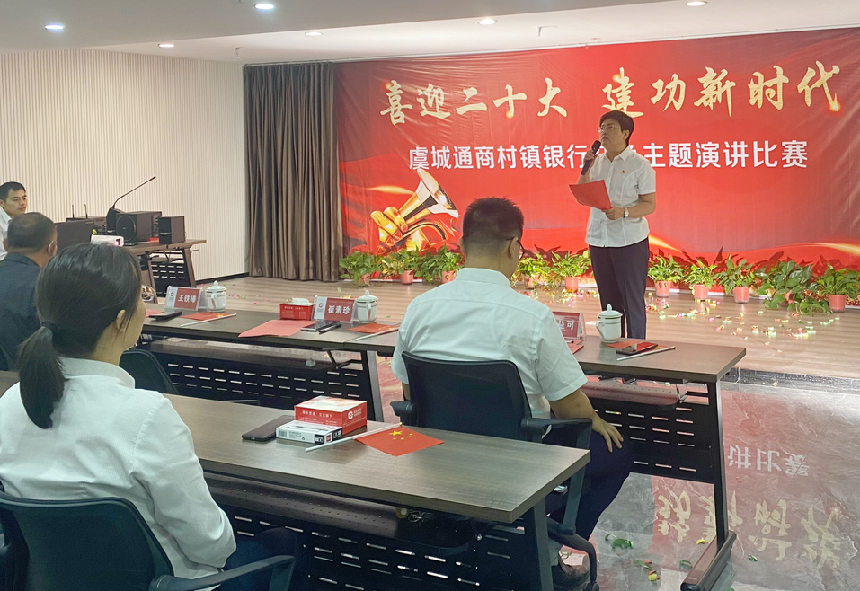 为庆祝中国共产党成立101周年,激发干部员工爱国爱党的热情和历史责任感,以昂扬的精神、奋进的姿态迎接党的二十大胜利召开。9月23日,虞城通商村镇银行举办“喜迎二十大 建功新时代”主题演讲比赛。中共虞城县直机关工委书记王铁棒,县人社局、党建办主任李鹏鹏及我行领导班子成员出席活动并为获奖选手颁奖。