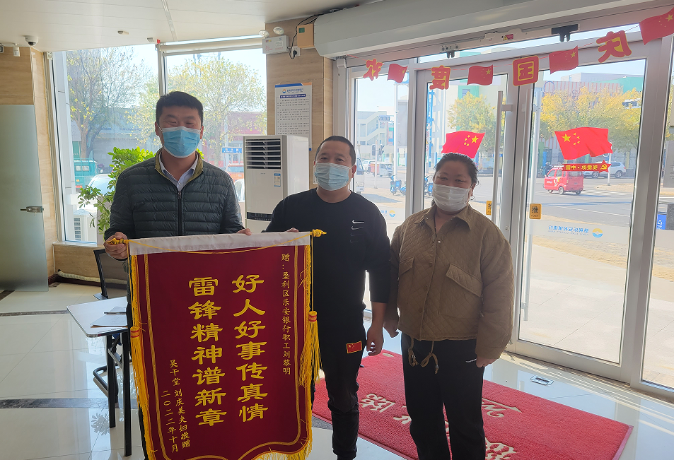 2022年10月19号上午,一面写着“好人好事传真情,雷锋精神谱新章”的锦旗送到了垦利乐安村镇银行城区便民服务点负责人刘黎明的手上,穿着朴实的一对中年夫妇紧紧握着他的手久久舍不得撒开,大姐红红的眼眶始终噙着泪水,几度哽咽,语不成声:“真是太感谢您了,您就是我们的恩人呀”。