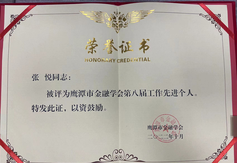 10月21日,在鹰潭市金融学会第九届会员代表大会上,对鹰潭市金融学会第八届先进单位、先进个人进行了表彰。其中鹰潭月湖恒通村镇银行张悦荣获金融学会“先进个人”荣誉称号。