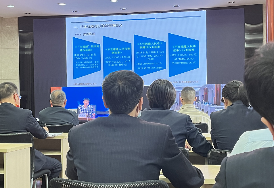 2022年中国人民银行正式印发《不宜流通人民币纸币》行业标准,本标准规定了不宜流通人民币类型和评价标准,明确了检测方法,提出了检测采样点的规范性附录。11月人民银行杭州中心支行开展了培训工作,各县(市)设立了分会场进行了视频培训,松阳恒通村镇银行相关工作人员参加了该视频培训。