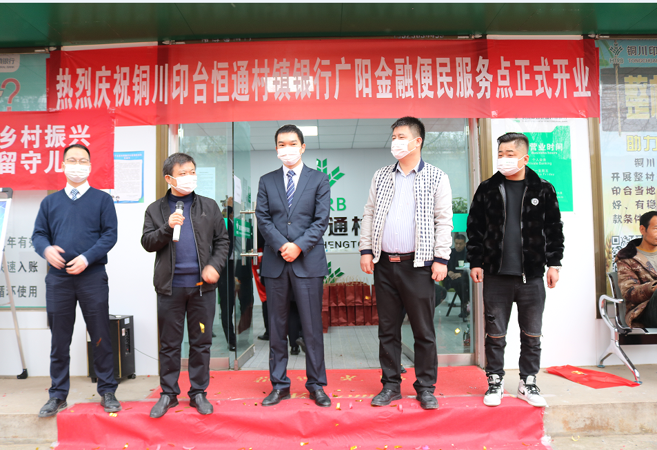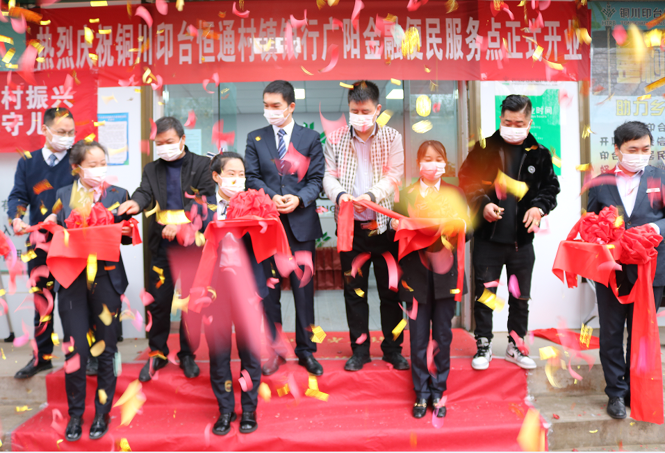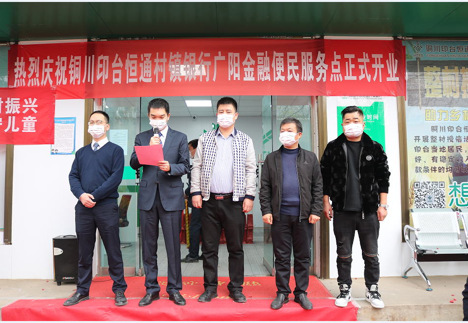 2022年11月9日,铜川村行广阳金融便民服务点在铜川市印台区广阳镇街道正式落成开业,参加开业仪式的领导有铜川村行行长王志靖、副行长陈金淼、铜川市印台区金融办主任李军峰,铜川市印台区广阳镇副镇长李小噗,客户代表广阳镇小燕子幼儿园园长程一浩,此次开业仪式由我行信贷管理部贾卫平主持。