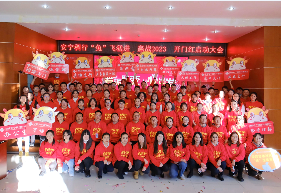 承前启后谱新篇,誓师奋进新征程。为统一思想,明确目标,凝聚合力,提振士气,奋力夺取2023年“开门红”胜利, 2022 年 11 月 18 日下午,云南安宁稠州村镇银行(以下简称“安宁村行”)在召开“兔”飞猛进 赢战2023新春开门红启动会。村行领导班子,各部室、支行负责人,全体营销人员,后台管理部室全体员工参加会议。
