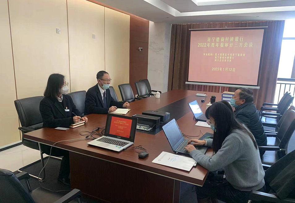 1月12日下午,海宁德商村镇银行、嘉兴银保监分局海宁监管组、浙江同方会计师事务所审计组开展了2022年度年报审计三方会谈,会议由海宁德商何成松副行长主持,海宁监管组卢杨副主任、同方会计师事务所派驻2名审计人员以及海宁德商合规与风险管理部总经理和审计科科长参加了此次会谈。
