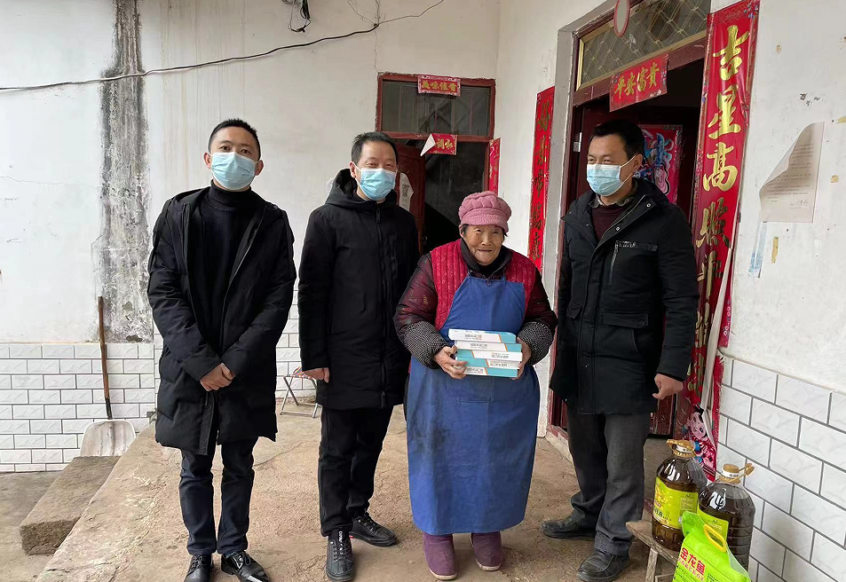 贡井区分队。副行长黄鸿带领贡井支行、资保部、业发一部前往桥头镇增产村和玉麟村,在区人大谭主席和村两委、村主任等人员的陪同下,为2名困难学生和2户困难家庭送上了温暖,带去了慰问金和油、米等慰问品。玉麒村的候大叔视力一级残疾,并患有高血压和脑血管病,夫妇二人基本失去劳动力,但他仍然努力生活,力所能及做一点农活,他感动地说:“你们过年还想着我们,送这么多用的来,还帮我们贴上对联,实在是对我们太好了!”临别前一直目送着大家离开,这样一幕幕感人的情景让在场的员工们为之动容。