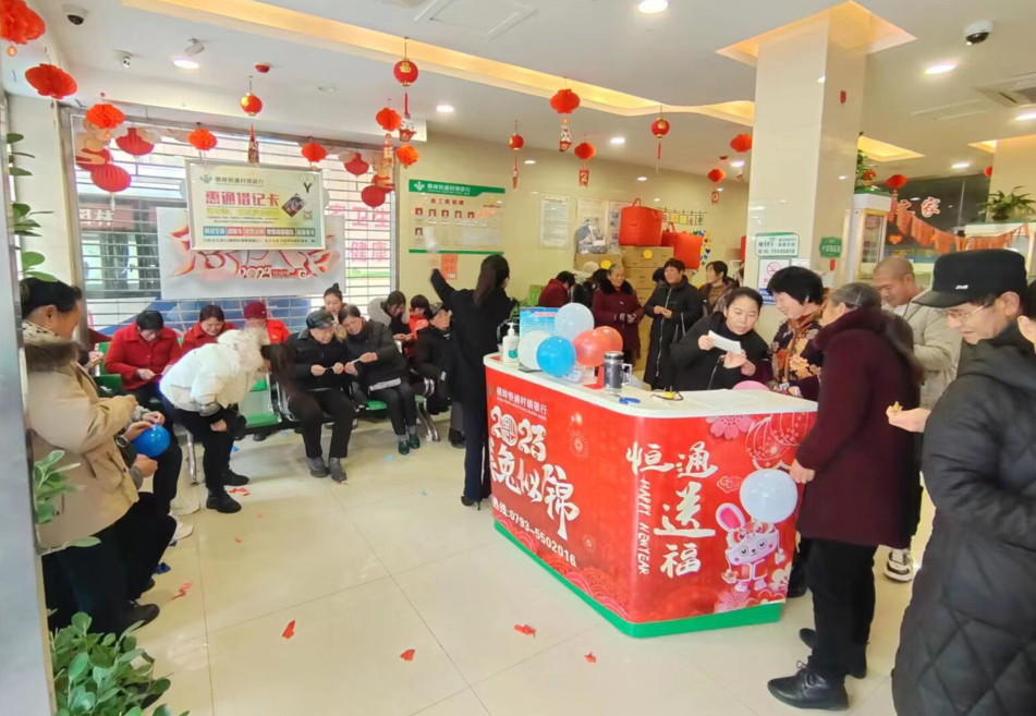 2月3日-2月5日,横峰恒通村镇银行总行营业部,分别在营业厅堂和青板乡金鸡村村委举办“‘玉兔闹元宵,元宵送福’活动。活动内容有金融知识宣传、灯谜,趣味游戏,有奖竞答、趣摸福字游戏等组成,吸引了大批老百姓参与。现场气氛活跃,获得客户一致好评。葛源支行举办“新春福满庆元宵”感恩客户回馈活动,通过开展趣味游戏、送礼品、加深与客户的沟通,提升客户服务体验。司铺支行开展“新春福满庆元宵”营销活动,为办理业务的客户送上节日祝福,在弘扬传统文化的同时拉近客户距离。