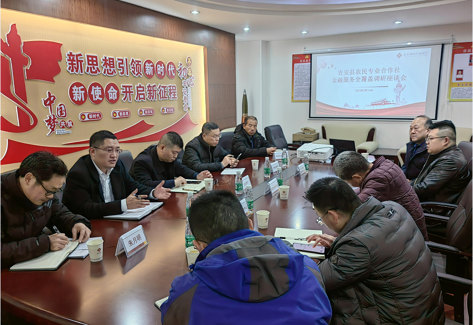2月14日,吉安县农民专业合作社金融服务全覆盖调研座谈会在吉安稠州村镇银行(以下简称“我行”)三楼会议室召开,吉安市金融办朱月明科长,吉安县普惠金融中心罗军峰主任,县农业农村局、农业银行、中小企业融资担保公司、庐陵农商行、吉安稠州村镇银行分管理领导及吉安县农民专业合作社代表参加了本次调研座谈会。