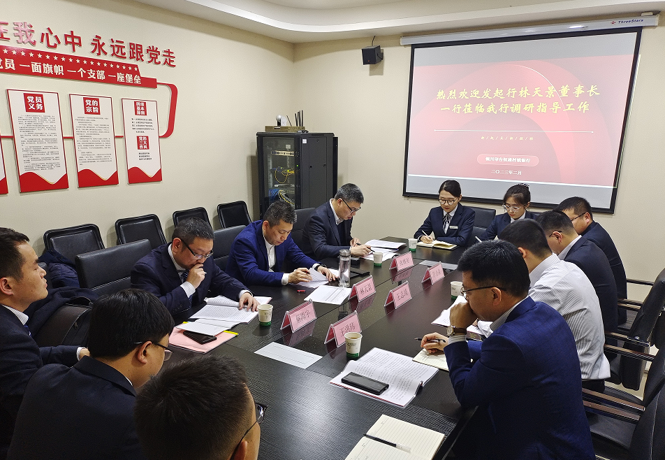 2023年2月23日,发起行董事长林天景、村行管理部总经理蔡海宇、审计部副总经理张维星一行来该行调研、指导工作。林天景董事长与该行领导班子谈话交流,了解该行现阶段总体发展情况。