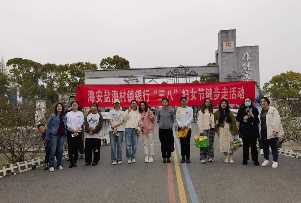 为丰富员工的业务生活,缓解枯燥繁重的工作压力,增强员工队伍凝聚力和向心力,让大家度过一个欢乐、祥和的节日。江苏海安盐海村镇银行以此次三八妇女节为契机,组织女性员工和先进个人去海安市墩头镇乐百年小镇开展健步走活动。