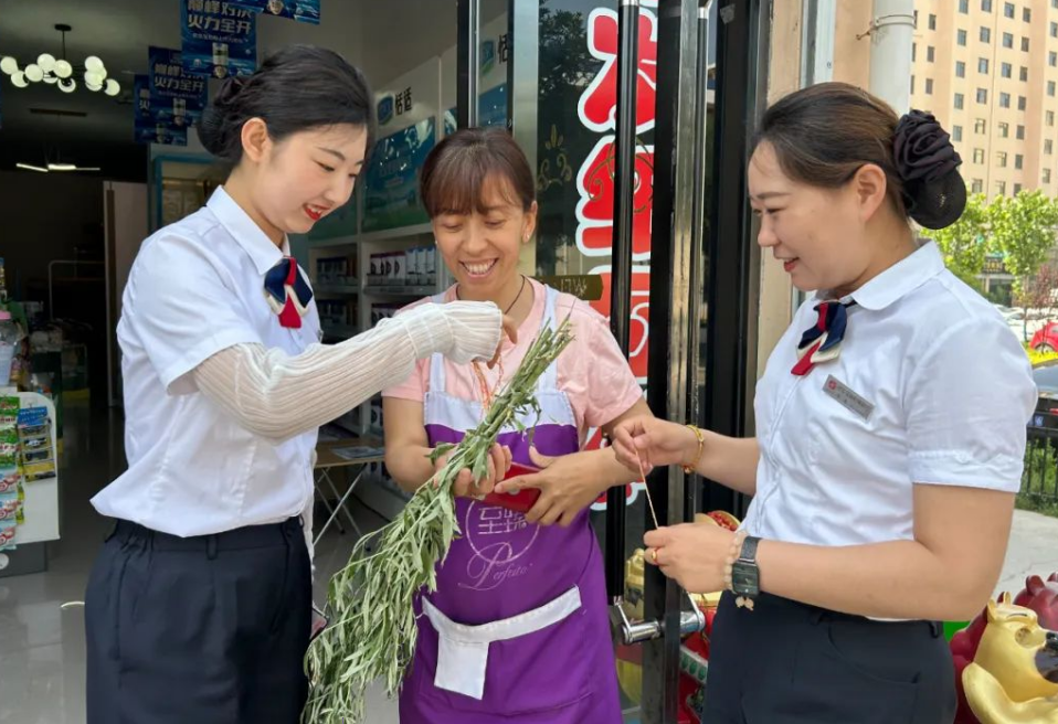活动现场,艾草和制作材料整齐地摆放在桌上,大家欢声笑语、热情高涨,伴随着艾草的清香,大家用端午节专属的青、白、红、黑、黄五种颜色的彩绳一点点编花、打结,制作好的五彩绳自己佩戴或者送给客户,寄予了对客户节日安康的祝福。