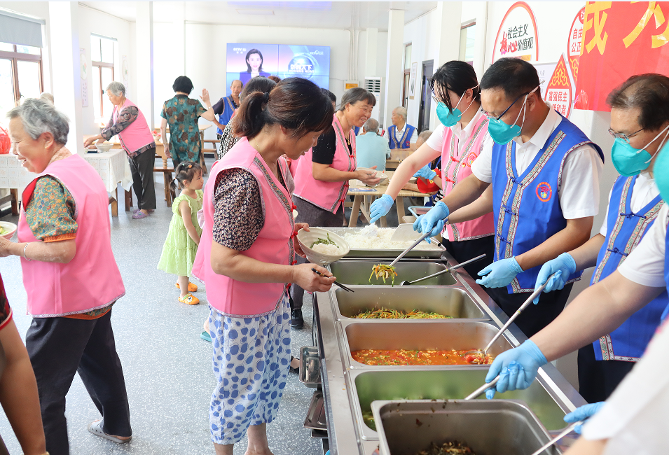 近40的室外温度下,虽然每个人都已汗流浃背,大家还是一趟趟,将一箱箱牛奶等慰问品搬进敬老家园。尔后,又与老人们一起拉家常、谈时事,了解老人们的精神状态和生活状况。秉持“金融为民”理念,志愿者还向老人们普及了防范电信诈骗、养老骗局、非法集资等内容并现场进行互动,有效提升了老年人对金融诈骗的认识,提高了防骗意识和自我保护能力。午餐时间,大家分工有序、配合默契,摆碗、盛饭、打菜、舀汤,忙得热不亦乐乎。老人们品尝着美味的午餐,脸上洋溢着幸福的笑容。西金坞敬老家园的发起人徐洪军以及敬老院的老人们表示,非常感谢村镇银行党支部志愿者的到来,把关心关爱送到了老人的心坎上。