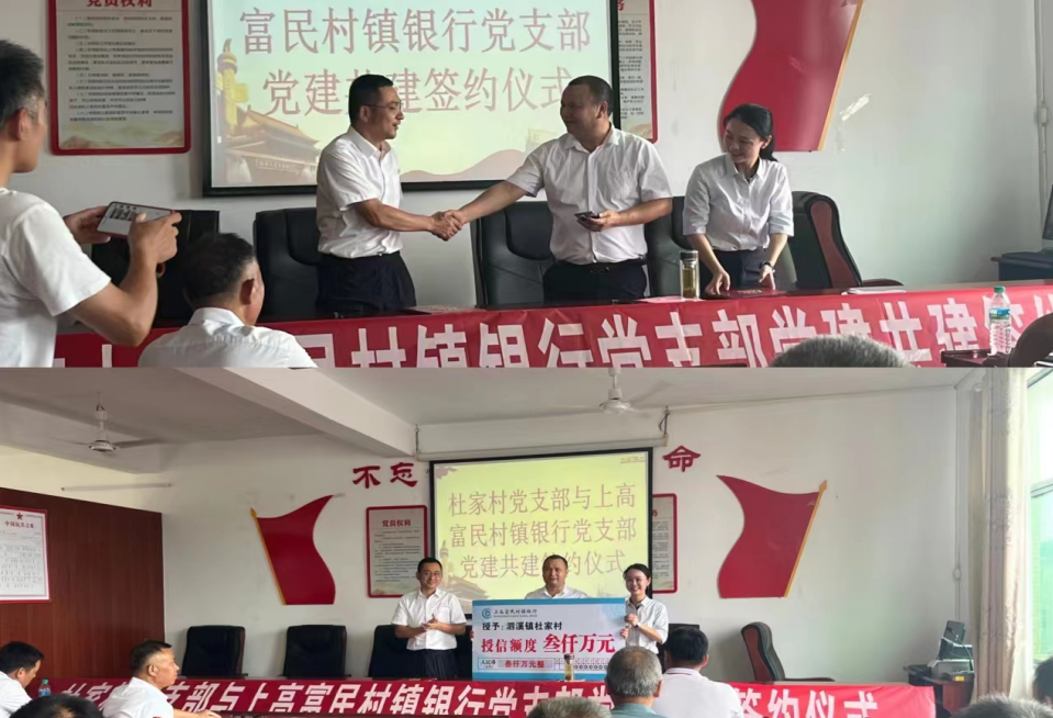 本次活动以重温入党誓词拉开帷幕,全体近50名党员,重温了入党誓词,之后全体党员干部饱含激情共同高唱《没有共产党就没有新中国》,用嘹亮的歌声向党的102华诞献礼,随后我行党支部书记、行长金国忠与杜家村支部书记杜小锋签署党建共建协议,双方围绕如何全面深入推动党建与业务发展深度融合,实现资源共享,通过开展普惠大走访,整村建档授信活动更好地服务村民。最后我行党支部宣传委员、泗溪支行负责人况琴代表上高富民村镇银行向杜家村授信叁仟万元。