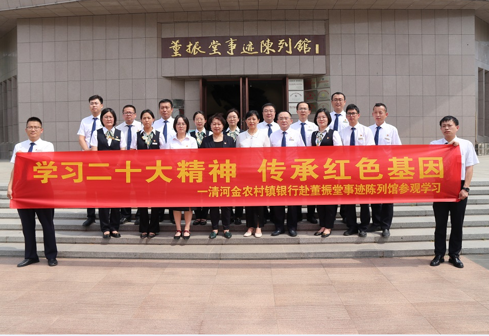 为深入学习贯彻党的二十大精神,按照发起行邢台银行党委《关于组织开展党的二十大精神集中学习的培训方案》要求,近日,清河金农村镇银行组织全体党员赴新河县董振堂事迹陈列馆参观学习,了解革命烈士英雄事迹,追忆共产党光荣革命历史,接受红色教育洗礼。