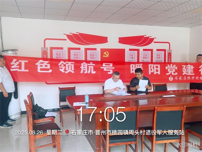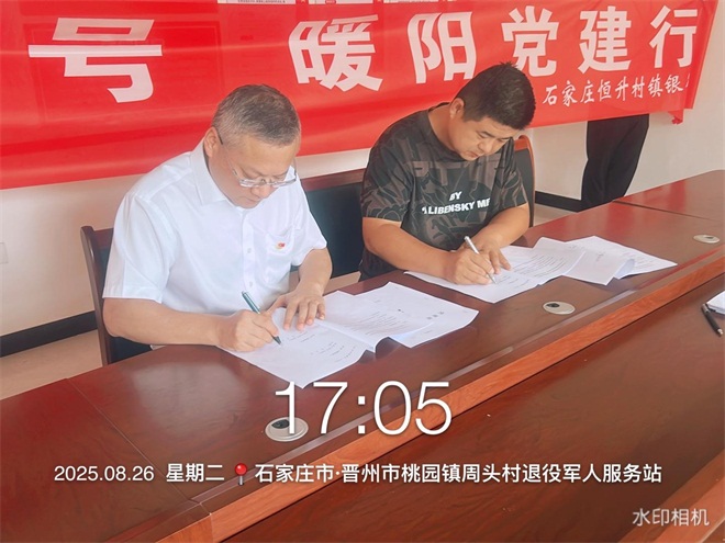 签约仪式在晋州市桃园镇周头村村委会会议室举行。石家庄恒升村镇银行党支部书记、行长汪亮荣与晋州市桃园镇周头村党总支部书记曹冠超共同出席并签署《党建联盟合作协议书》。双方党组织负责人分别介绍了各自党建工作特色及业务发展概况,并就如何通过党建联盟平台深化合作、实现共赢进行了深入交流。