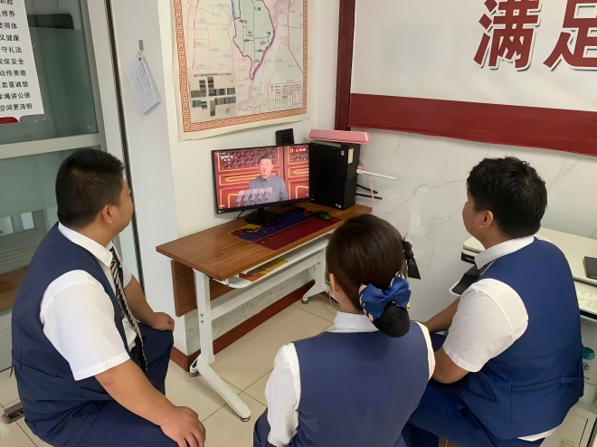 上午,万都班子和机关员工围坐在五楼会议室屏幕前,一同聚焦这场承载着民族记忆与时代豪情的盛典,各网点员工也分别在基层组织观看。当护旗方队迈着铿锵有力的步伐护送国旗入场,当受阅部队以严整的军容展现出过硬的风采,当先进的装备列阵而过彰显出强大的科技实力,现场不时响起阵阵发自内心的激动的掌声。这掌声中,有对革命先烈的深切缅怀,有对国家富强的由衷自豪,更有对这和平年代来之不易的深刻感悟。