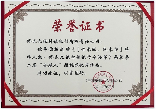 近日,为展现“金融人”的家国情怀和生活中的“小确幸”,通过细微之处彰显新时代金融人的精神风貌,传播正能量与美好瞬间,讲好金融故事,由农业农村部主管的《中国农村信用合作报》社举办的“第二届‘金融人’短视频大赛”在北京人大会议中心圆满落幕。修水九银村镇银行选送的作品《【你来做,我来学】榜样人物:修水九银村镇银行宁海军》从全国122家机构的300余件作品中脱颖而出,荣获“优秀作品奖”。