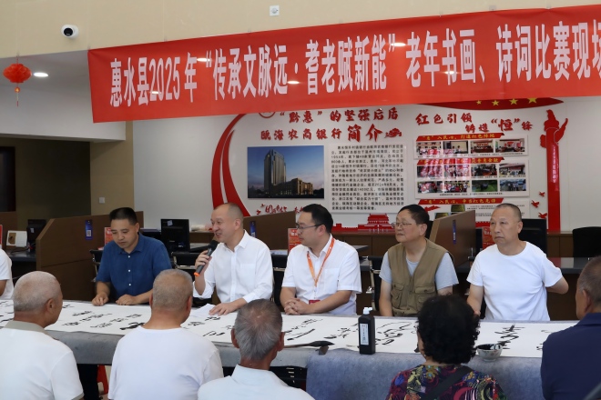 秋阳杲杲,惠风和畅。9月28日,由中共惠水县委老干部局、惠水县老年大学、惠水县关心下一代工作委员会、惠水县文化艺术界联合会四家单位联合主办;惠水恒升村镇银行、惠水县老年书画研究会承办;惠水县书法家协会、惠水县美术家协会、惠水县诗联、惠水县文化馆、惠水县灯谜协会协办的2025年“传承文脉远 耆老赋新能”老年书画诗词笔会,在惠水恒升村镇银行成功举办,惠水恒升村镇银行董事长何胜义作活动开场致辞。