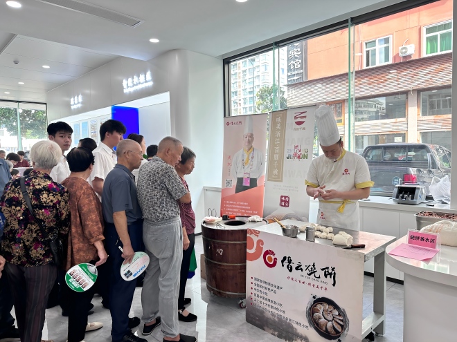 在烧饼摊位前,大师现场揉面、烤制,香气四溢的烧饼吸引众多客户驻足。“缙云烧饼,趁热吃!”现烤的烧饼送到每位客户手中。