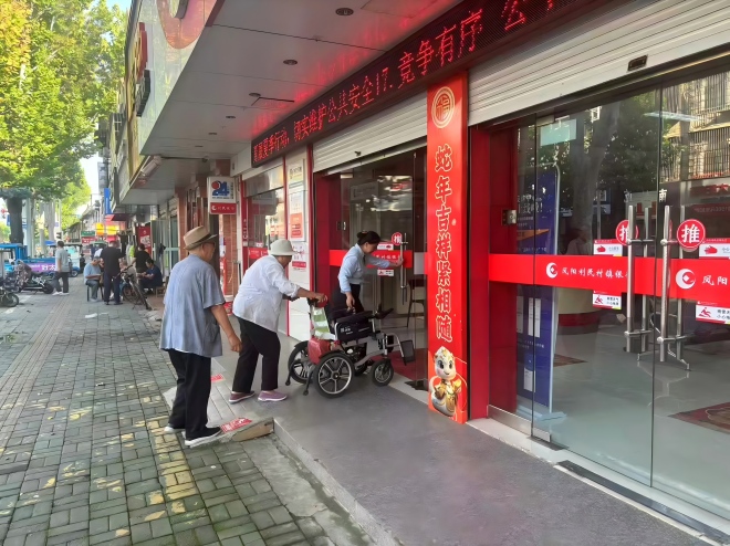 近日,凤阳利民村镇银行中都支行营业厅内上演了一幕温暖人心的场景。一对年近九旬的老夫妻推着轮椅前来办理定期储蓄业务,行动不便的模样刚出现在门口,便被当值大堂经理敏锐察觉。