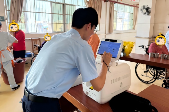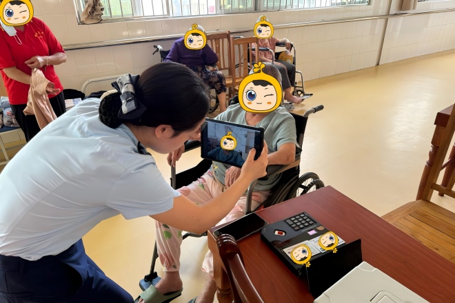 在业务办理过程中,客户经理轻声与老人沟通,安抚其情绪,在吴女士和福利院工作人员的协助下,通过移动设备现场为老人办理了社保卡补办业务。从信息确认、拍照到制卡、激活,整个流程如行云流水,仅仅用了不到15分钟,一张崭新的社保卡便成功交到了家属手中。
