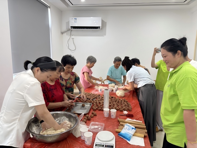 2025年10月5日上午9时许,德清湖商村镇银行洛舍支行工作人员早早地来到洛舍镇洛漾社区烘焙室做起准备工作。首先由烘焙老师向大家演示了月饼面团揉制、馅料调配、烘烤温度控制等关键步骤,从油皮酥皮的层次感把控,到肉馅的搭配技巧等,同时细致解答了现场提问。随后大家分工协作,亲手体验制作乐趣。一部分人制作肉馅,一部分人将揉好的面团按压成圆饼,一部分人将面饼裹住肉馅按压成型。现场不时传来阵阵笑声,部分客户分享儿时中秋记忆,与身边人畅谈节日习俗,整个活动现场充满了温馨的氛围。