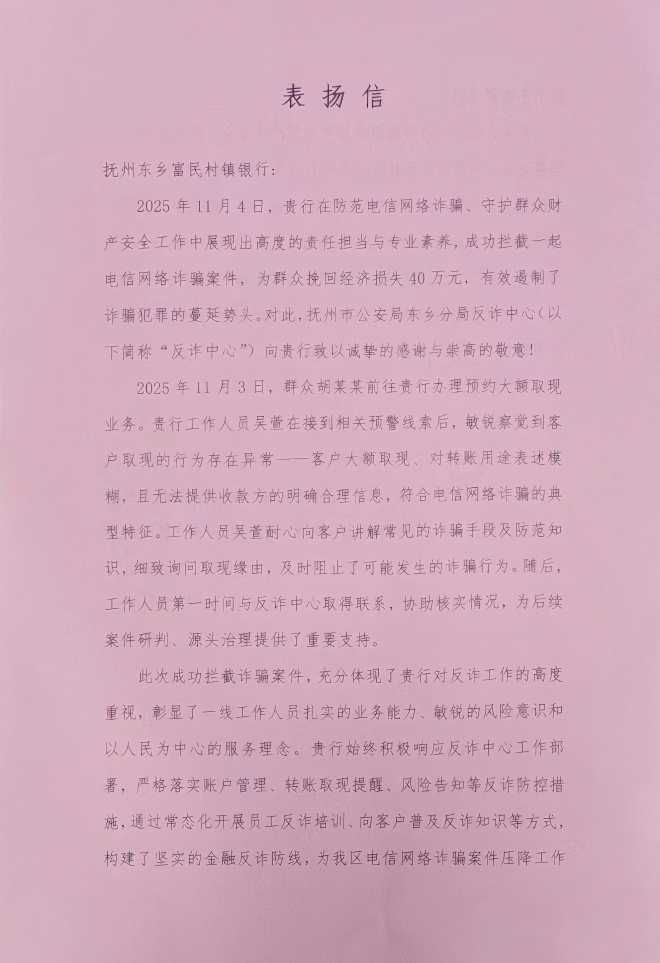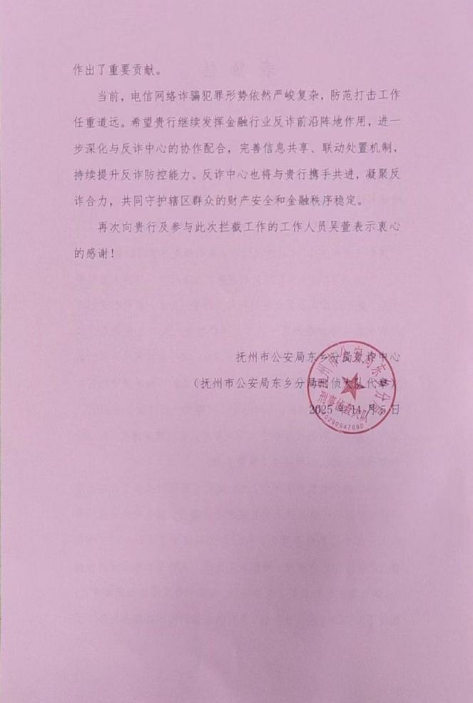 近日,东乡富民村镇银行(以下简称“我行”)凭借高度的责任心和专业的风险识别能力,在防范电信网络诈骗、守护群众财产安全工作中展现出高度的责任担当与专业素养,成功拦截一起精心设计的电信诈骗案件,及时为客户挽回了40万元的经济损失,有效遏制了诈骗犯罪的蔓延势头,以实际行动守护了人民群众的财产安全。对此,抚州市公安局东乡分局反诈中心(以下简称“反诈中心”)向我行致以诚挚的感谢与崇高的敬意!