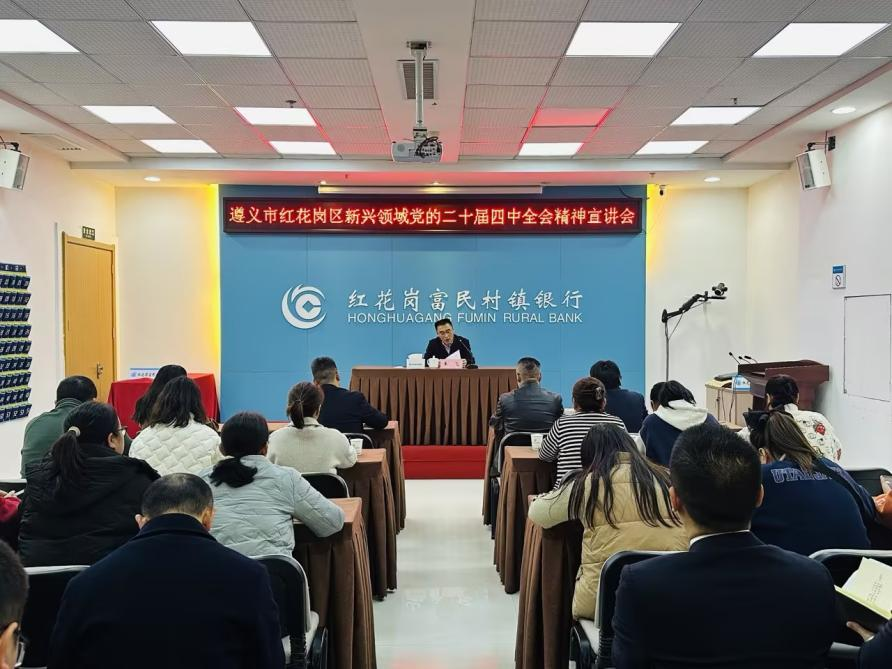 12月1日,遵义红花岗富民村镇银行(以下简称“该行”)邀请遵义市红花岗区委社会工作部部长、区委两新工委书记王飞同志到该行开展党的二十届四中全会精神专题宣讲。该行全体党员、中层干部及来自社区的二十名村居党员代表共同参加了学习。