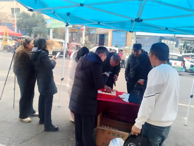 热闹之余,服务更暖。工作人员化身“反诈讲师”,用方言结合鸡蛋上的标语,讲解防骗知识和信贷、电费代缴等业务,让老百姓在“赶大集”中,既装满“菜篮子”,也充实“钱袋子”。