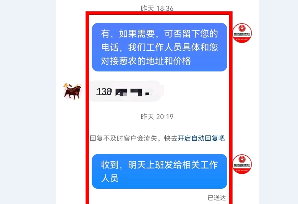 今年年初,赵海水、周立红二人在了解了近两年的大葱市场后,决定合伙种植山东“铁杆大葱”,当“金融村官”孙龙坤知晓二人有合作种植大葱的意向时,第一时间与他们对接,解决了二人资金上的后顾之忧。如今到了大葱丰收的季节,孙龙坤在回访时,发现客户遇到了大葱滞销的情况,赵海水感叹的说:“襄汾万都村镇银行能再帮我一下就好了”。孙龙坤立即将情况向行领导汇报,经过行党支部认真讨论,达成共识,贷款客户要帮、困难群众也要帮,我们要尽自己的一份力为他们减少损失。