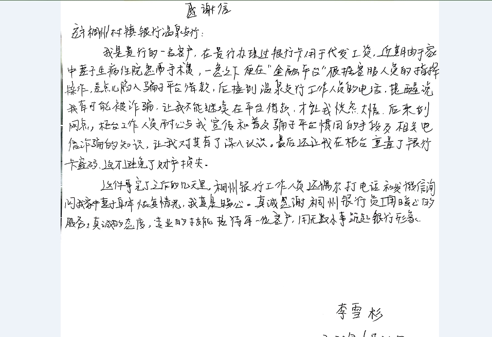 近年来,安宁村行始终将金融知识宣传和风险防范融入金融服务,不断组织员工开展防诈骗演练,提升安全防范意识和应急处置能力,切实维护消费者的合法权益。近日,云南安宁稠州村镇银行温泉支行(以下简称“温泉支行”)成功拦截了一起电信诈骗案件。6月22日客户带着亲自手写的感谢信送到温泉支行,表达了深深的感激之情。