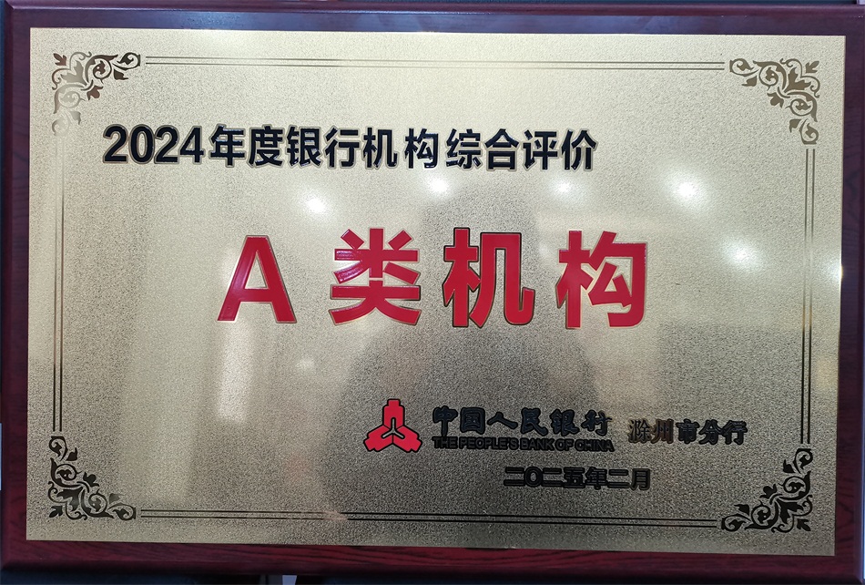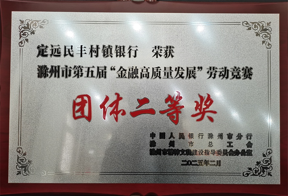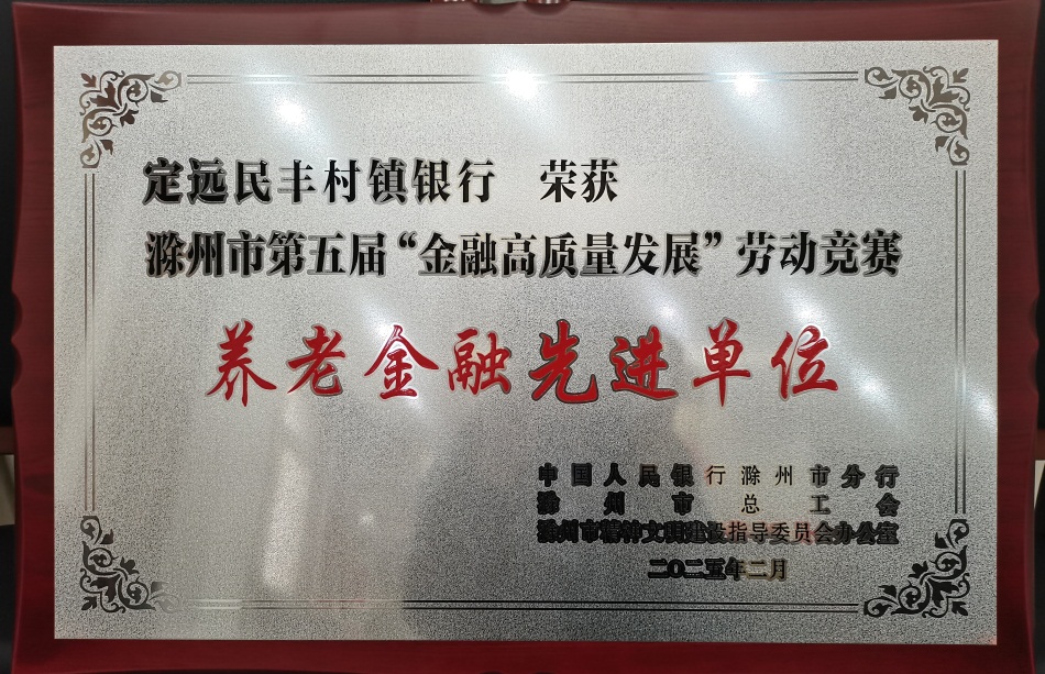 2月28日,在中国人民银行滁州市分行召开的全市金融机构主要负责人会议上,定远民丰村镇银行荣获“滁州市第五届金融高质量发展劳动竞赛”二等奖、养老金融先进单位和2024年综合评价A等级等三项殊荣,受到表彰。