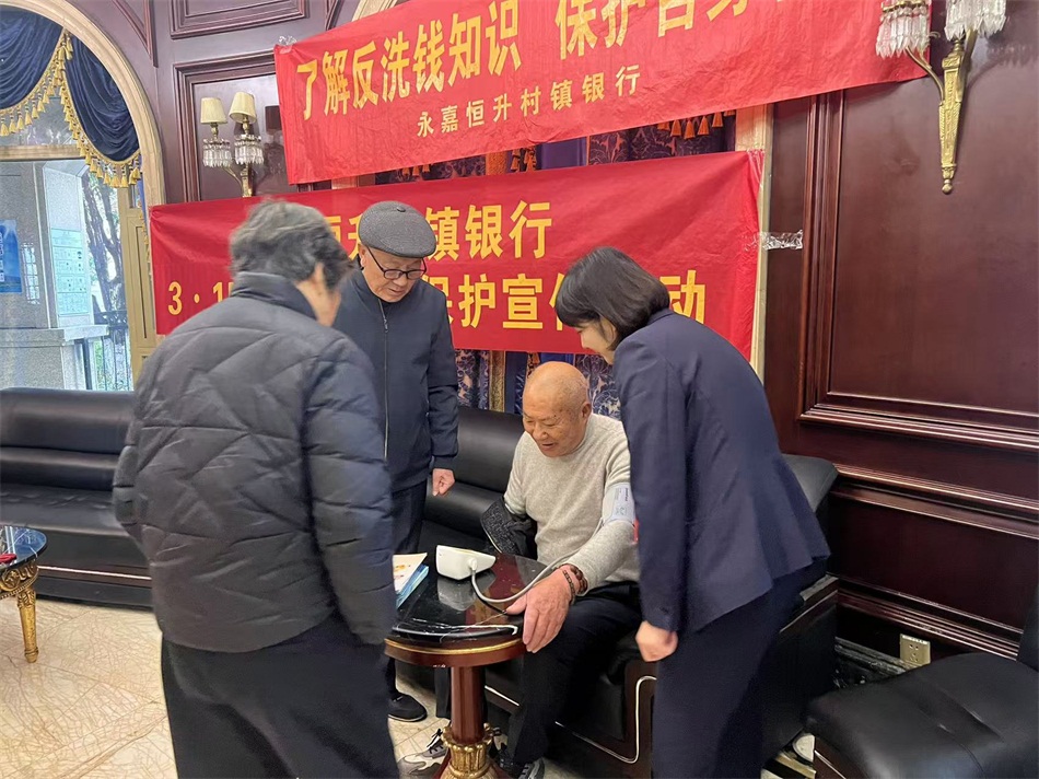 黄田支行走进金色嘉园小区,聚焦老年群体开展关怀活动。工作人员为老人细致测量血压,耐心叮嘱健康生活要点,随后开启金融知识小课堂,用生动案例揭露常见诈骗手段,如“保健品骗局”“以房养老陷阱”,提醒老人守护财产安全。