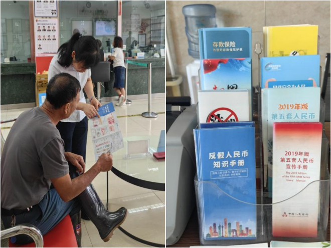 以网点为前沿,通过摆放宣传折页、电视机循环播放宣传片、工作人员现场演示识假技巧,向客户普及人民币防伪知识。