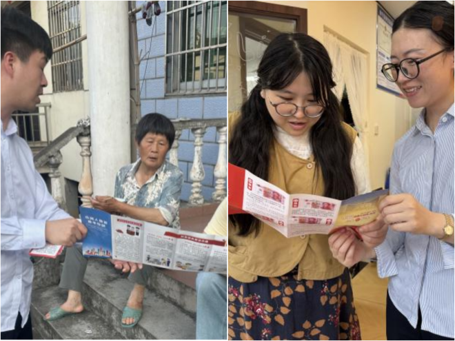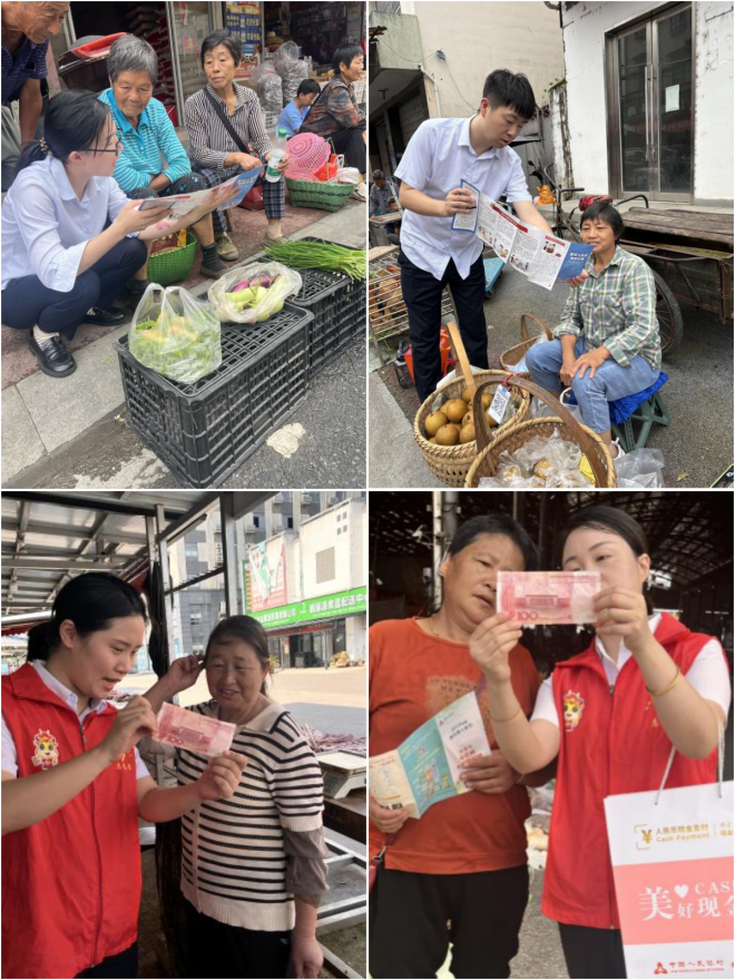下沉乡村集市,用通俗语言讲解流通中人民币防伪特征、假币犯罪类型及处罚规定、假币犯罪举报奖励办法和举报方式。