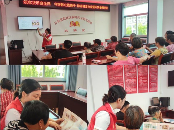 深入社区举办讲座、设咨询台,运用实物人民币教学,讲解如何通过“一转、二摸、三透光”方法辨别假币,向老年人宣传常见假币骗术惯用手法、防骗及识假知识。