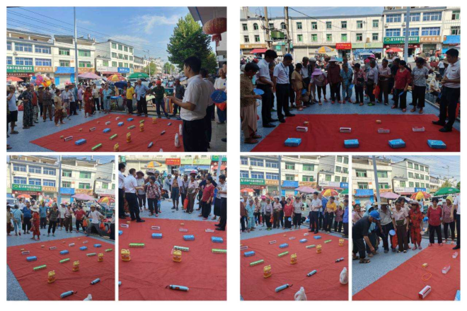 活动前,该行工作人员提前铺开红毯搭建临时“礼品台”,摆放的礼品有洗衣液、洗洁精、纸巾、碗具三件套等日常用品,同时也准备好印有该行服务热线的塑料袋、清热消暑的免费凉茶,为周边观看的群众送上清凉与便捷。刚布置完就吸引了许多村民驻足询问,活动规则简单明了:到场村民均可获得一次套圈机会,扫描活动码签到并完成金融问卷小调查,增加一次套圈机会,当场办理该行任意业务即可再送2次套圈机会,套中礼品可当场带走,零门槛参与让现场很快热闹起来。