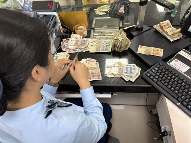 了解情况后,白沙支行的工作人员当即上前安抚蒋阿姨:“阿姨,您放心,零钱残损币我们都可以兑换的!”一句肯定的答复,瞬间打消了蒋阿姨心头的顾虑。在大堂经理的悉心指引下,蒋阿姨来到了柜台前。