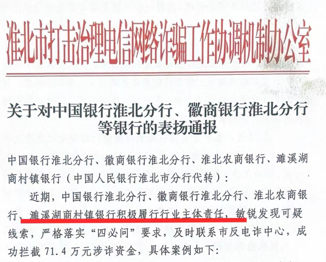 近日,淮北市打击治理电信网络诈骗工作协调机制办公室向濉溪湖商村镇银行发来通报表扬,对该行在电信网络诈骗风险拦截工作中的敏锐洞察、快速响应予以高度肯定,表彰该行以专业履职筑牢金融反诈“第一道防线”。
