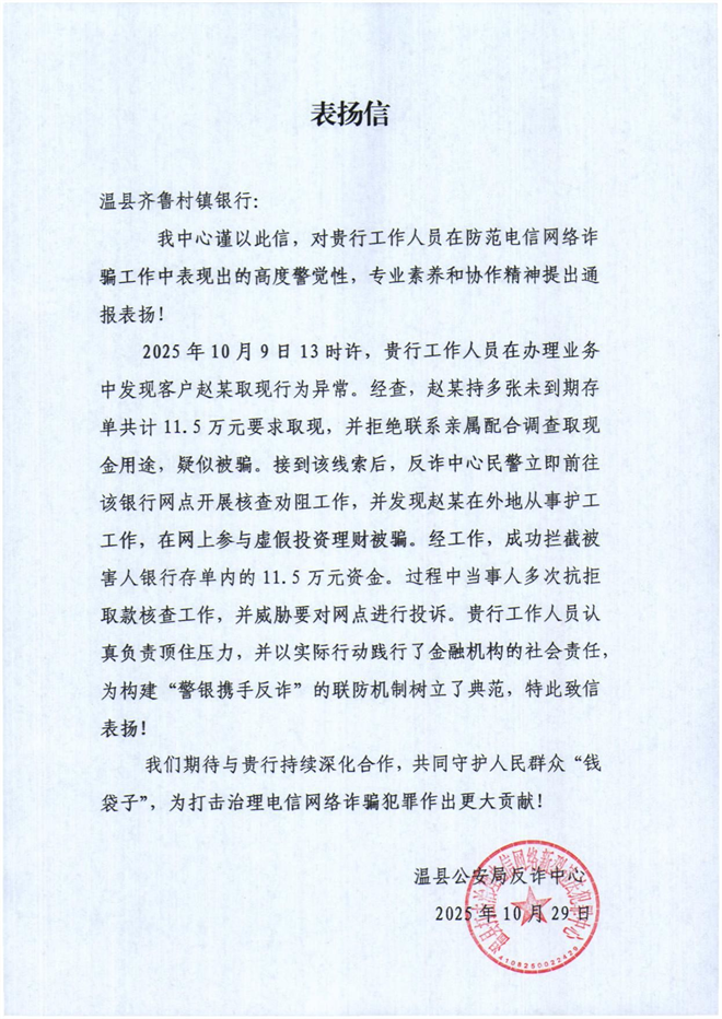 此次诈骗拦截不仅体现了银行一线员工的职业敏感与专业素养,也彰显了温县齐鲁村镇银行在反诈工作中取得的扎实成效。反诈中心在表扬信中特别肯定该行认真负责的工作态度,称其有力支持了区域反诈工作的开展。