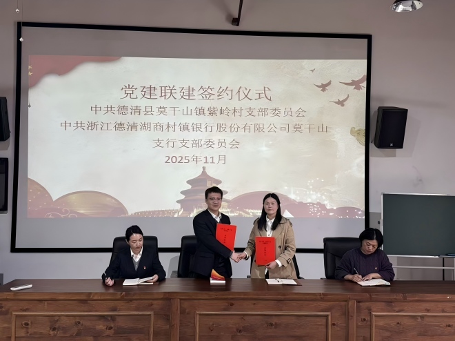 11月12日,浙江德清湖商村镇银行莫干山支行党支部与德清县莫干山镇紫岭村党支部在莫干山镇紫岭村党群服务中心举办“党建联建协议”签约仪式。莫干山支行党支部书记施晓锋,莫干山镇紫岭村党支部书记潘玉兰以及双方党员代表近10人参加活动。